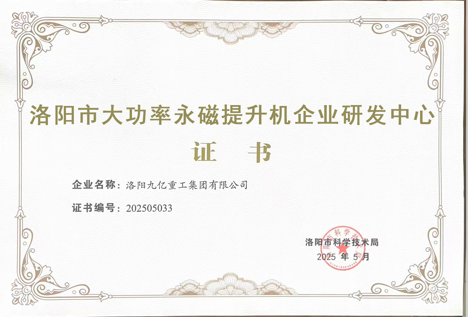 洛陽(yáng)市大功率永磁提升機(jī)企業(yè)研發(fā)中心證書(shū)